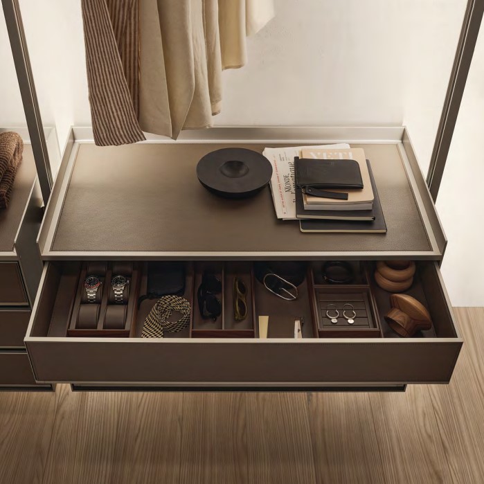 Struktur 304 platino, Glasböden 63 grigio trasparente, Shelves, drawer unit top, Innen synthetic Leder154 argilla